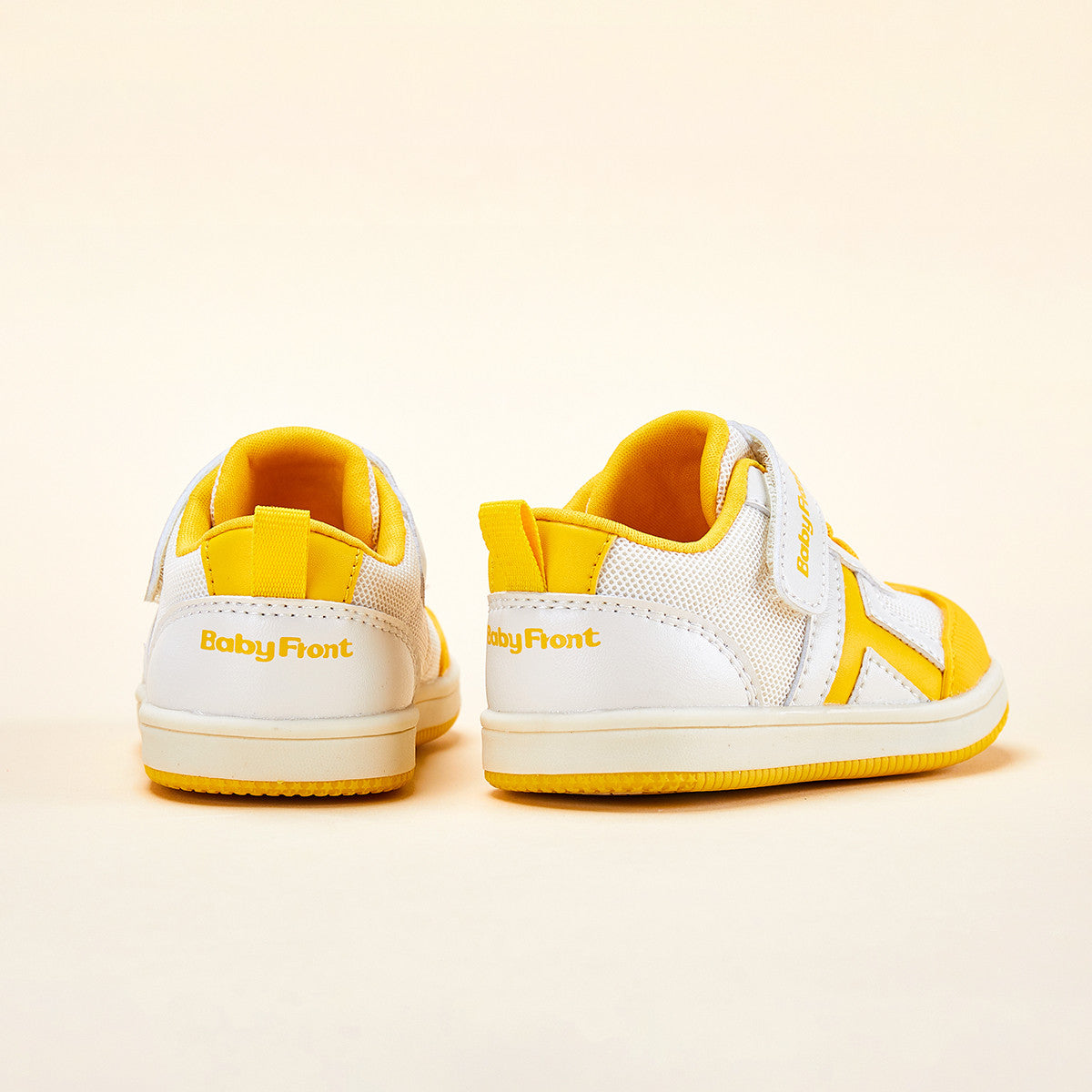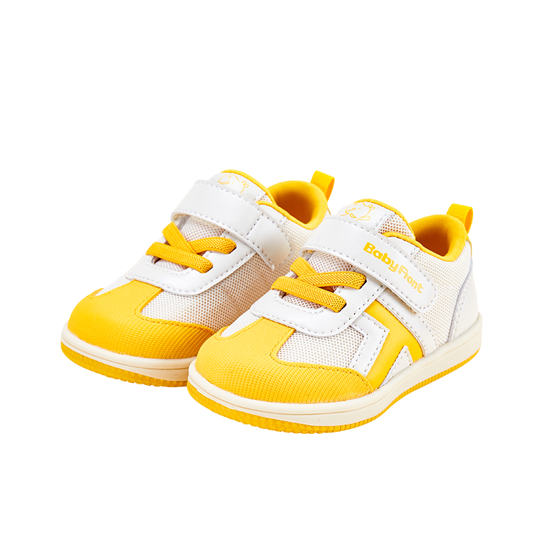 ☀️ Vibrant Sunburst Design - Bold yellow synthetic leather overlays on white breathable mesh upper, featuring embroidered sunshine icon and "BabyFont" logo in matching yellow